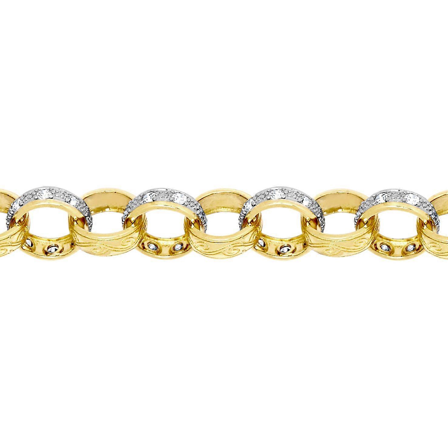 Jewelco London Men's Solid 9ct Yellow and White Gold White Round Brilliant Cubic Zirconia Hand Assembled Engraved Cast Belcher 11mm Gauge Chain Bracelet, 8.5 inch 21cm