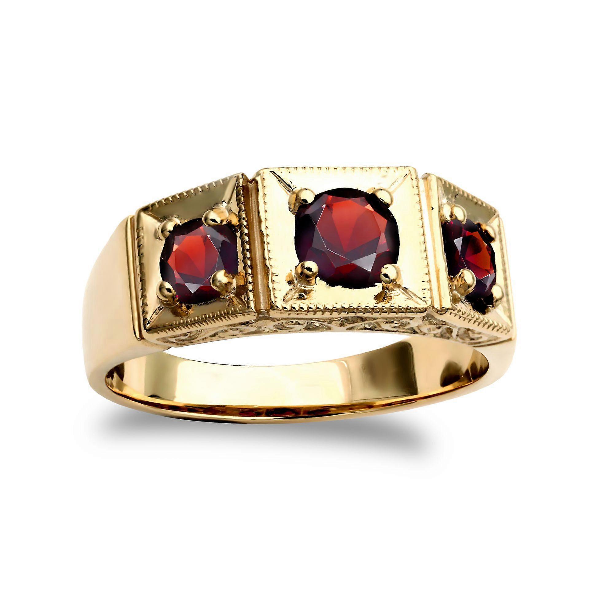 Jewelco London Men's Solid 9ct Yellow Gold Round Brilliant Garnet 3 Stone Trilogy Carved Gypsy Ring