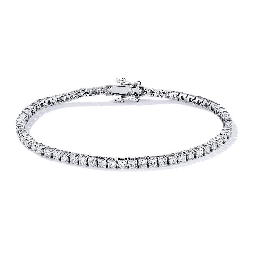 Jewelco London Sterling Silver rhodium Coated Cubic Zirconia tennis Bracelet with a figure of 8 box clasp. A beautiful and stunning piece of jewellery. This 925 rhodium plated sterling silver Tennis bracelet represents a classic and timeless piece. It consists of a single row of grade A cubic zirconia stones that encircle the wrist. This gorgeous bracelet is perfect for day wear and special occasions. Width: 2.5mm Length: 190mm Weight: 7.6g GEMSTONE: Cubic Zirconia, Round, 4ct SKU: ABB115A-2.5mm