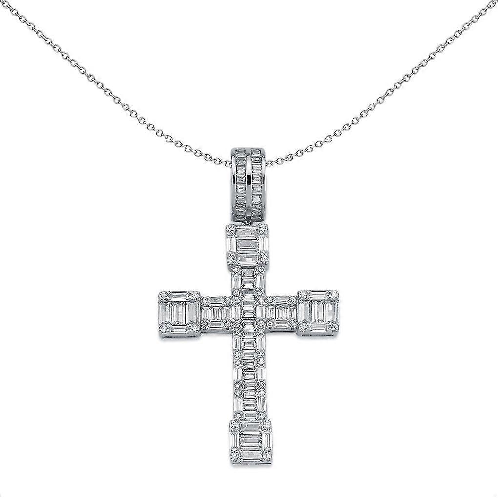 Jewelco London Rhodium Plated Sterling Silver Baguette Cubic Zirconia Art Deco Blocky Cross Pendant Necklace 51mm 18inch