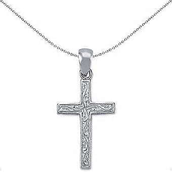 Jewelco London Rhodium Plated Sterling Silver Carved Cross Pendant Necklace 31mm 18 inch