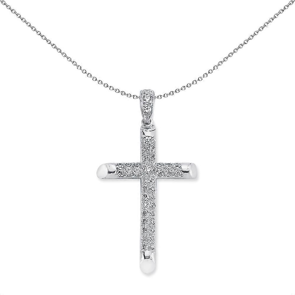Jewelco London Rhodium Plated Sterling Silver Round Cubic Zirconia 2 Row Pave Cross Pendant Necklace 50mm 18 inch