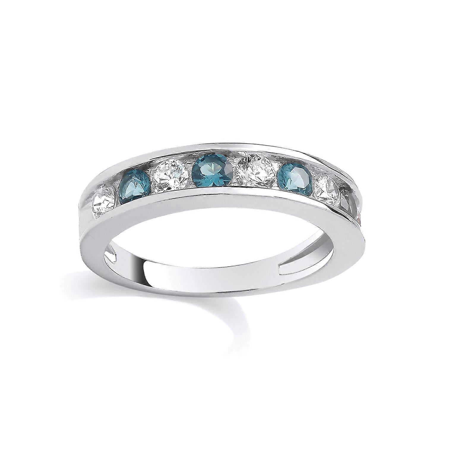 Jewelco London Rhodium Plated Sterling Silver Teal CZ Alternating Channel Set Half Eternity Ring
