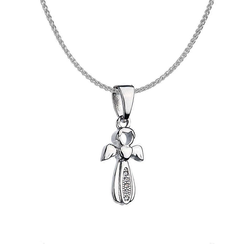 Jewelco London Rhodium Plated Sterling Silver White Cubic Zirconia Angel Design Cross Charm Pendant Necklace - 16>18 inch