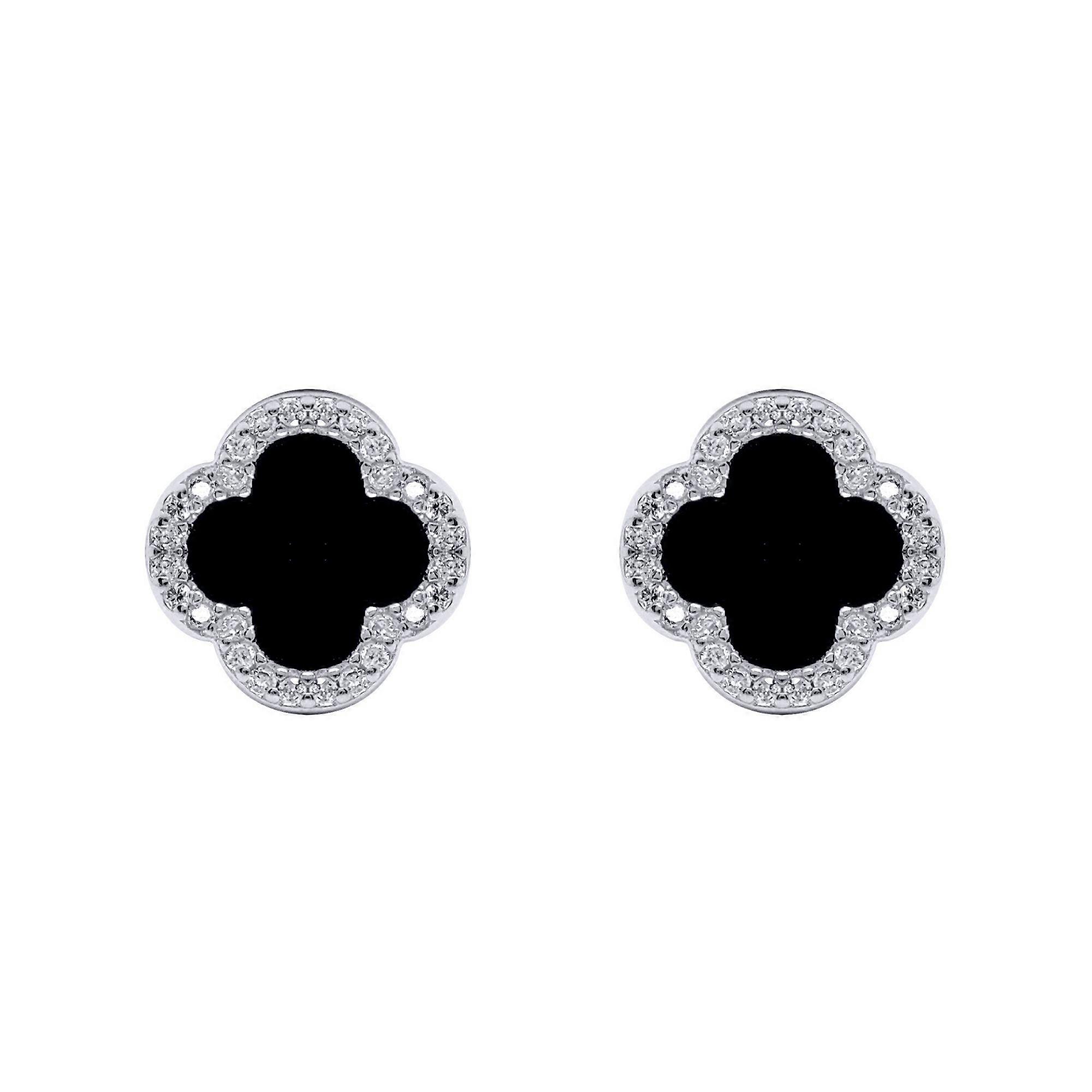 Jewelco London Rhodium Silver Black Clover Onyx & CZ Halo Lucky Charm Earrings 11mm