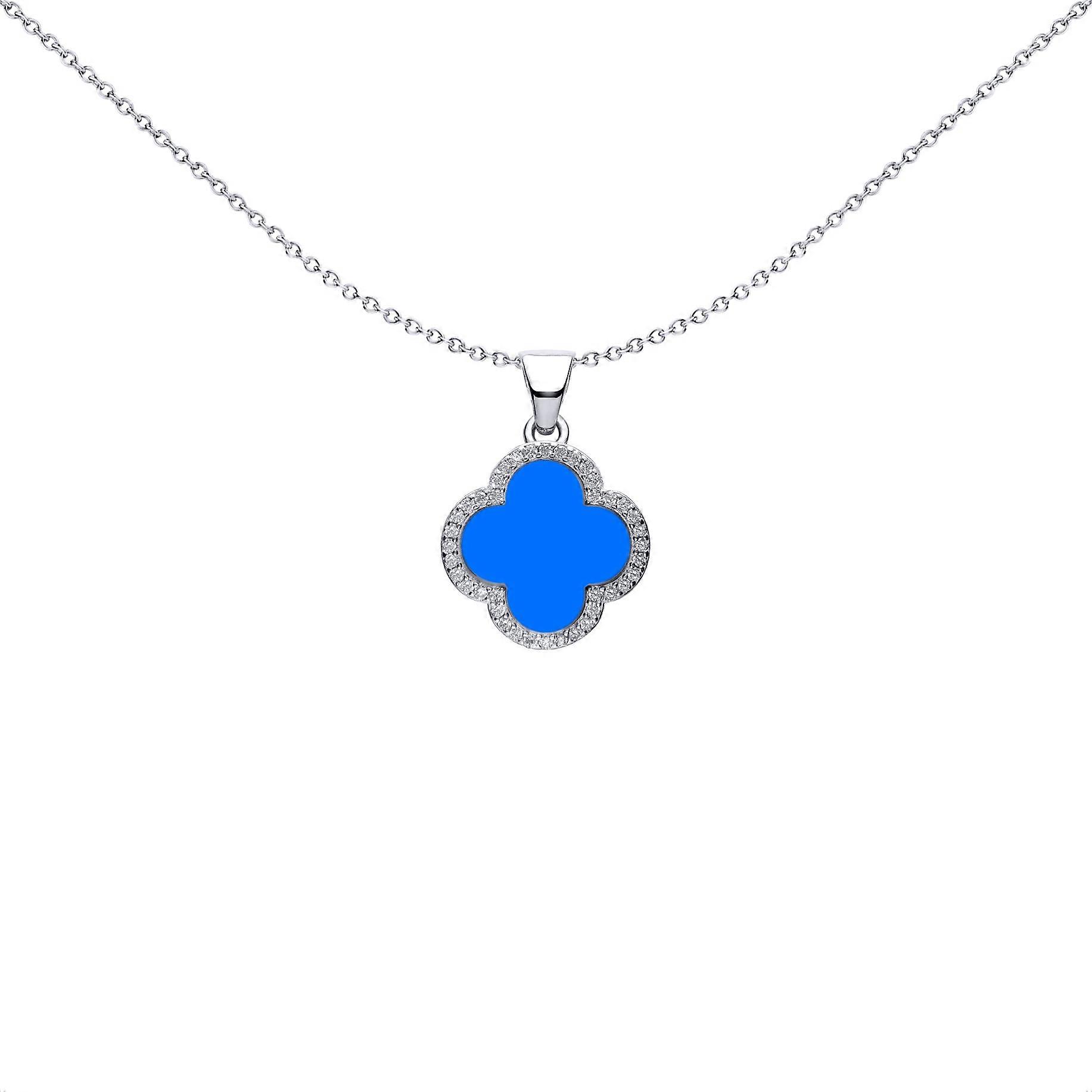 Jewelco London Rhodium Silver Blue Clover Agate & CZ Halo Lucky Charm Charm Pendant