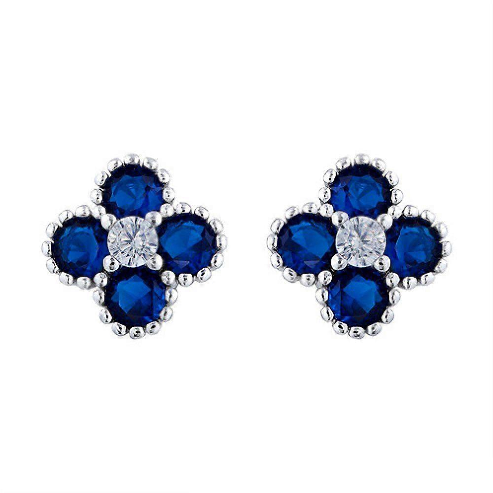 Jewelco London Rhodium Silver Blue Round Brilliant CZ Bead Edge Clover Cluster Stud Earrings