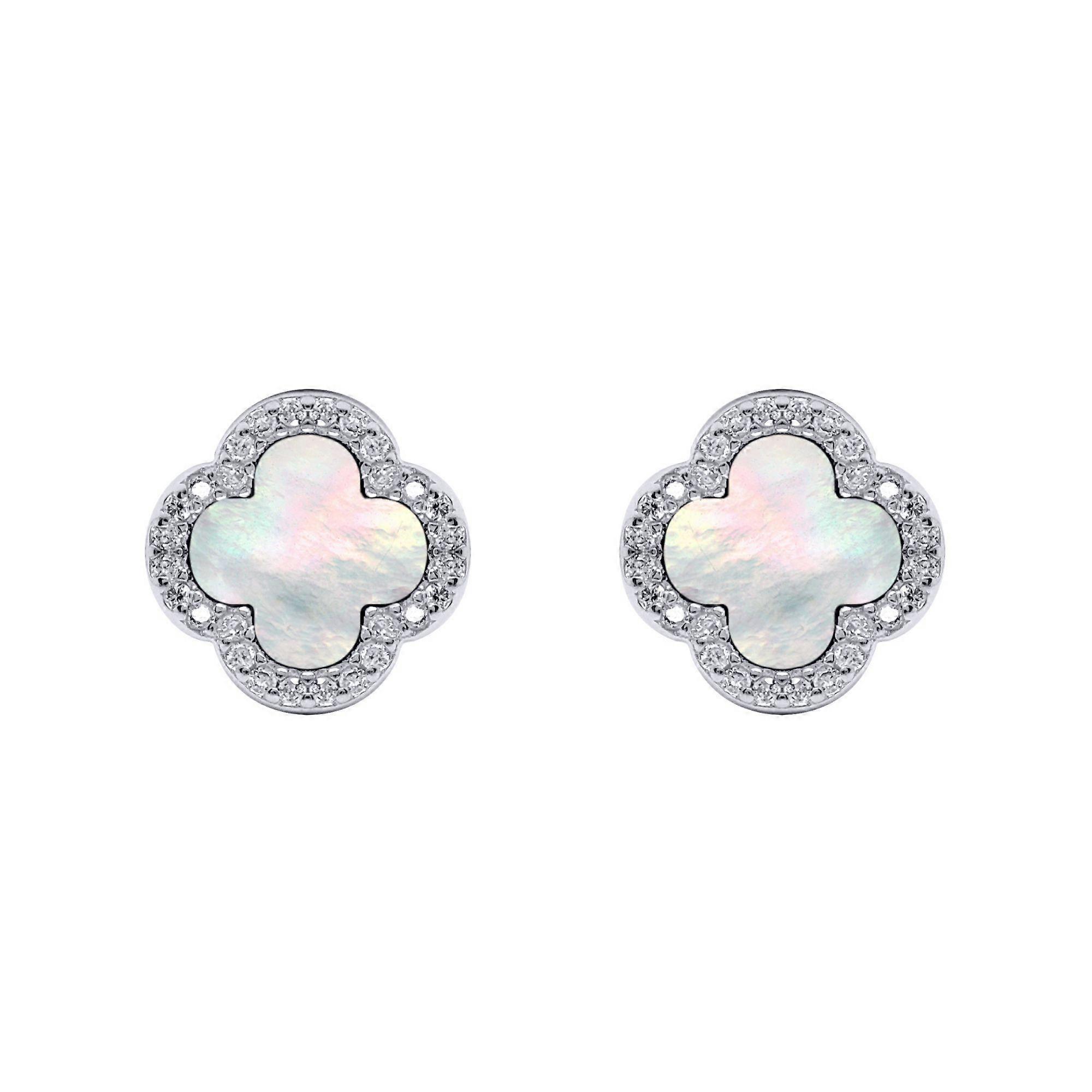 Jewelco London Rhodium Silver Clover Mother of Pearl & CZ Halo Lucky Charm Earrings 11mm
