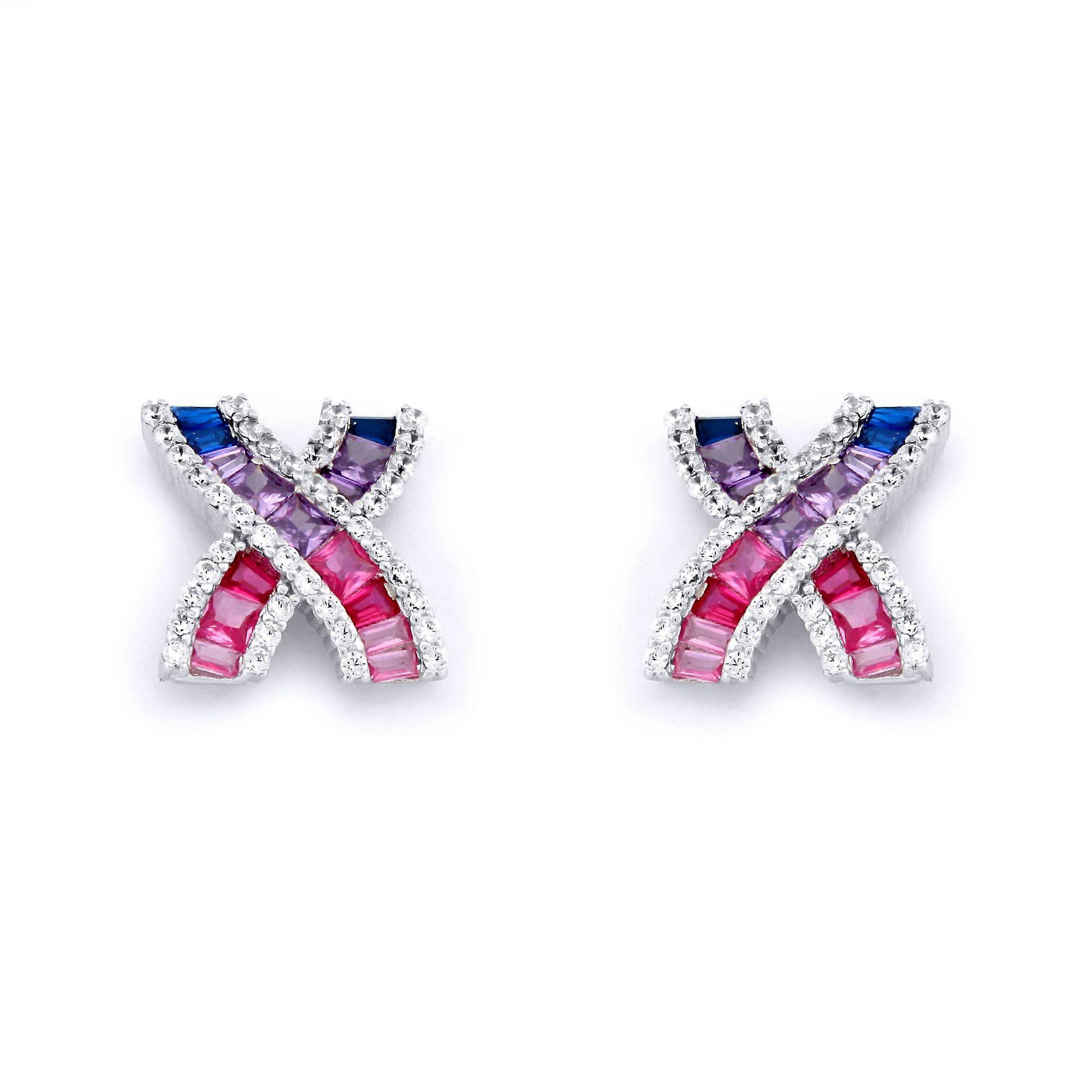 Jewelco London Rhodium Silver Pink Lilac Blue Princess Baguette CZ Crossroads Channel Kisses Stud Earrings