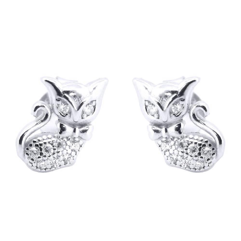Jewelco London Rhodium Silver Round CZ Cute Cats wearing Bowtie Stud Earrings