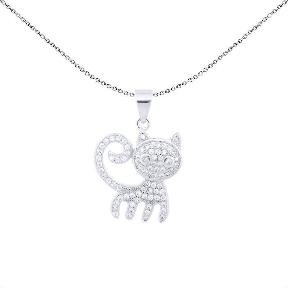Jewelco London Rhodium Silver Round CZ Cute Kitty Cat (or Alien) Charm Pendant