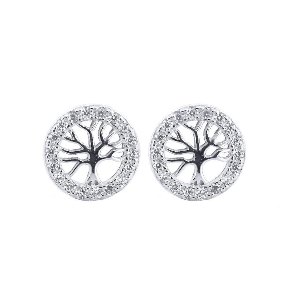 Jewelco London Rhodium Silver Round CZ Halo Circle Tree of Life Stud Earrings