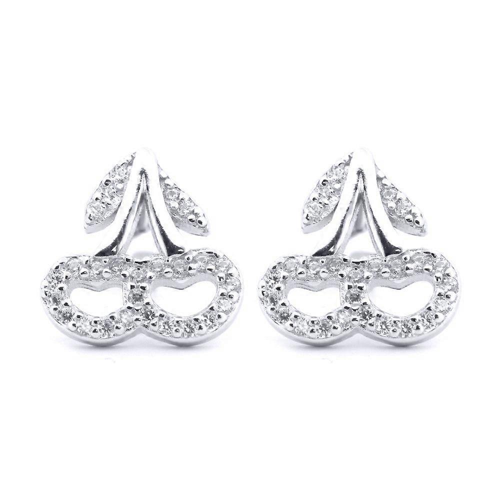 Jewelco London Rhodium Silver Round CZ Love Heart Cherry Pair Drops Stud Earrings