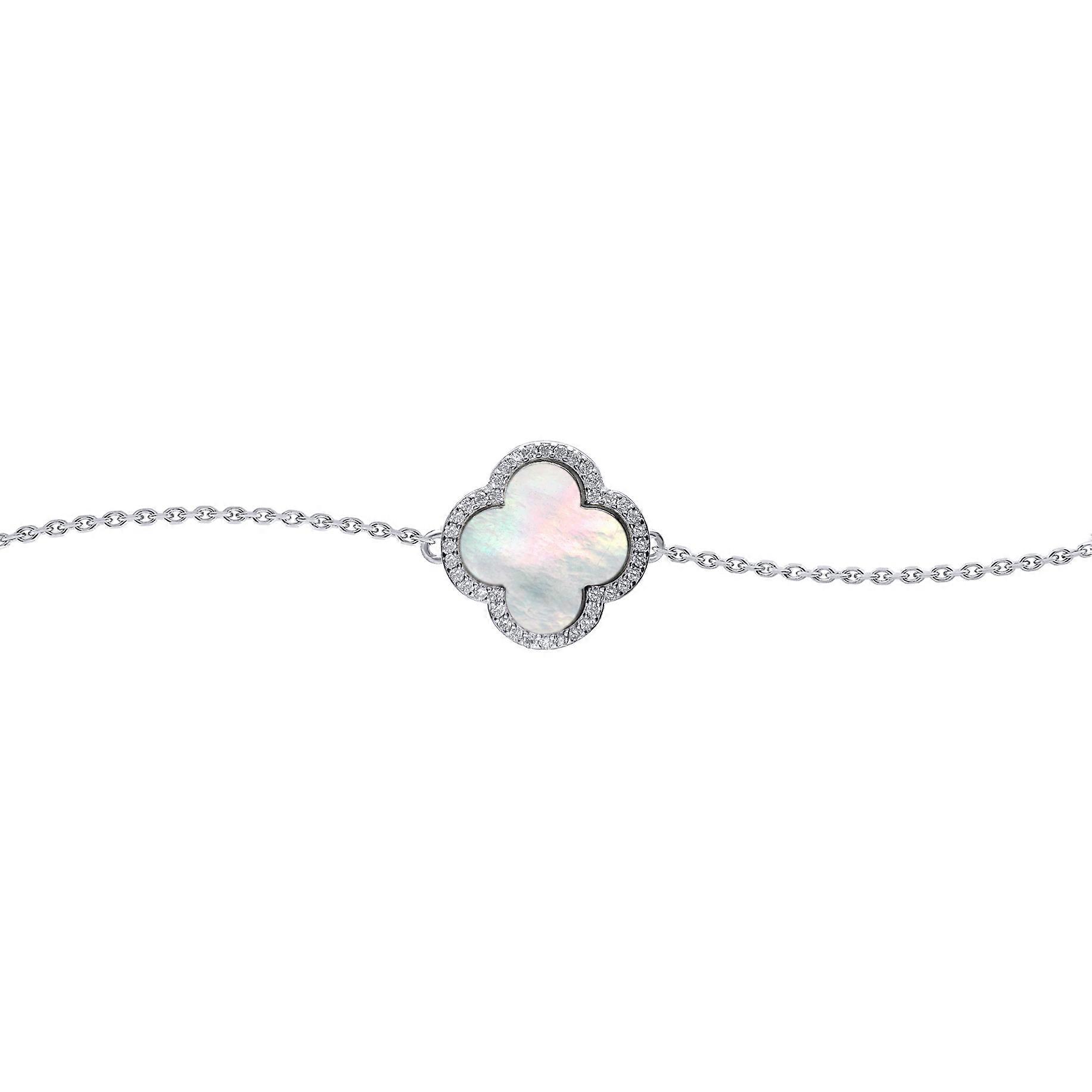 Jewelco London Silver Clover Mother of Pearl & CZ Halo Lucky Charm Chain Bracelet 7-8.5"