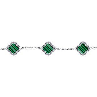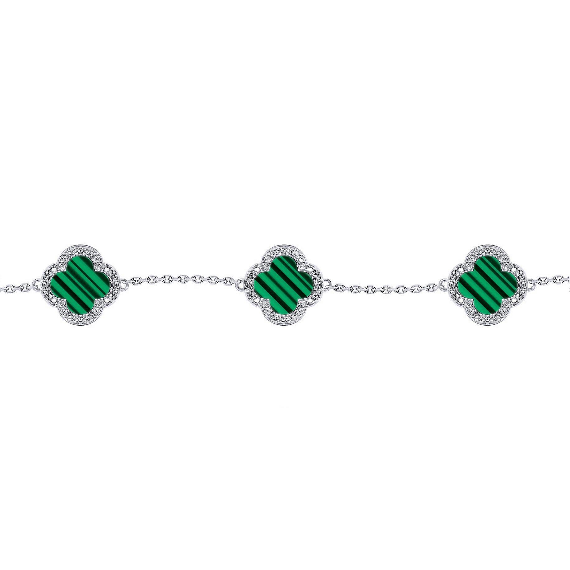 Jewelco London Silver Green Clover Malachite & CZ Halo Lucky Charm 5 Station Bracelet 7-8.5"