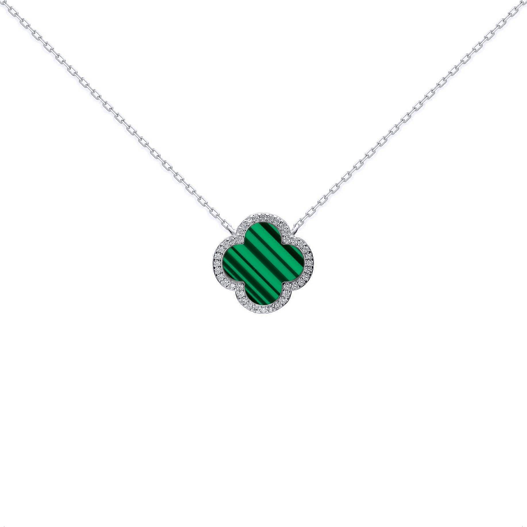Jewelco London Silver Green Clover Malachite & CZ Halo Lucky Charm Pendant Necklace 16-18"