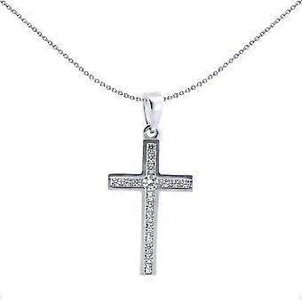Jewelco London Solid 9ct White Gold Cubic Zirconia Art Deco Outline Channel Set Cross Pendant