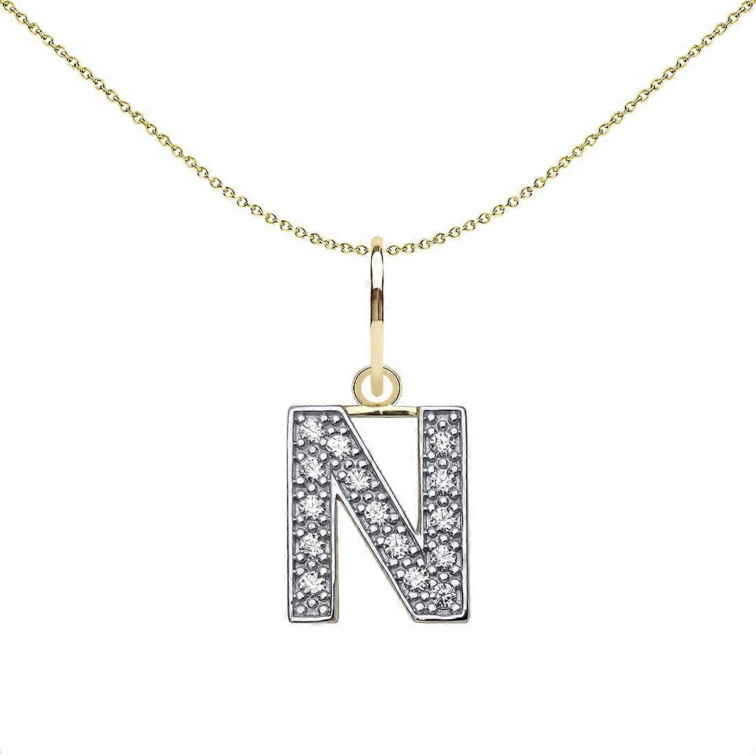 Jewelco London Solid 9ct Yellow and White Gold Cubic Zirconia 10mm San Serif Block Font Initial Charm Pendant, Letter N