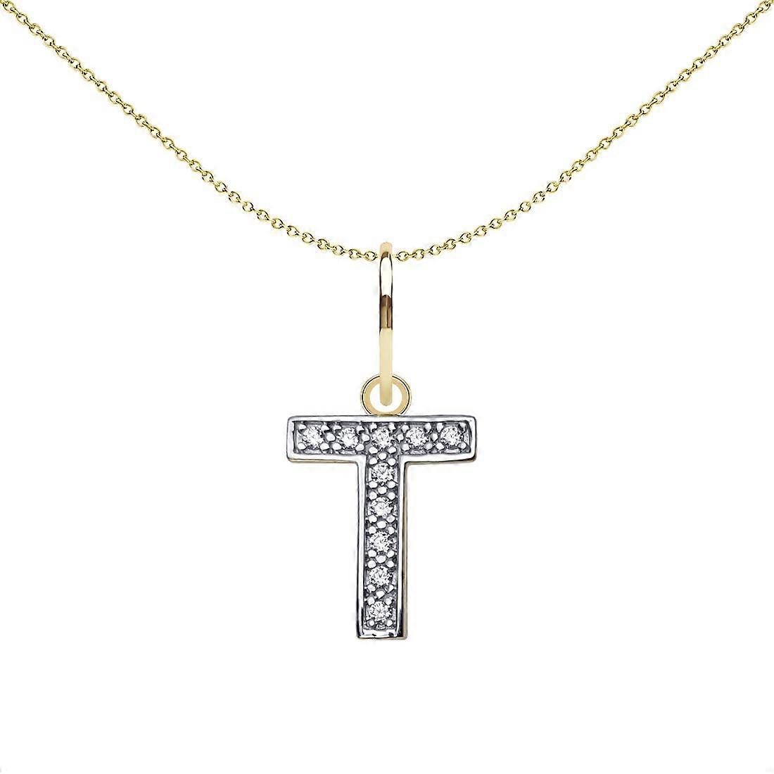 Jewelco London Solid 9ct Yellow and White Gold Cubic Zirconia 10mm San Serif Block Font Initial Charm Pendant, Letter T