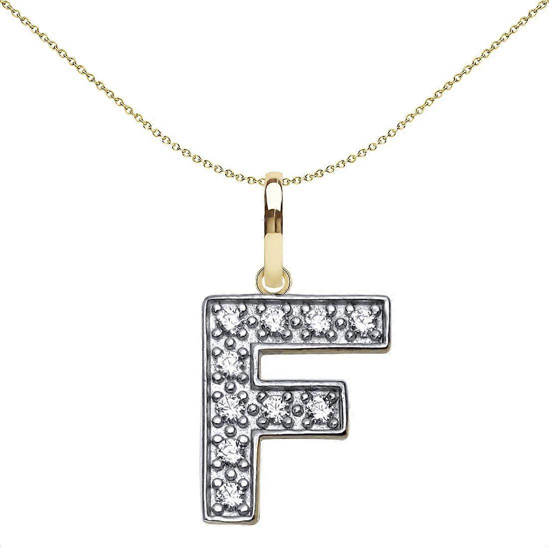 Jewelco London Solid 9ct Yellow and White Gold Cubic Zirconia 15mm San Serif Block Font Initial Charm Pendant, Letter F