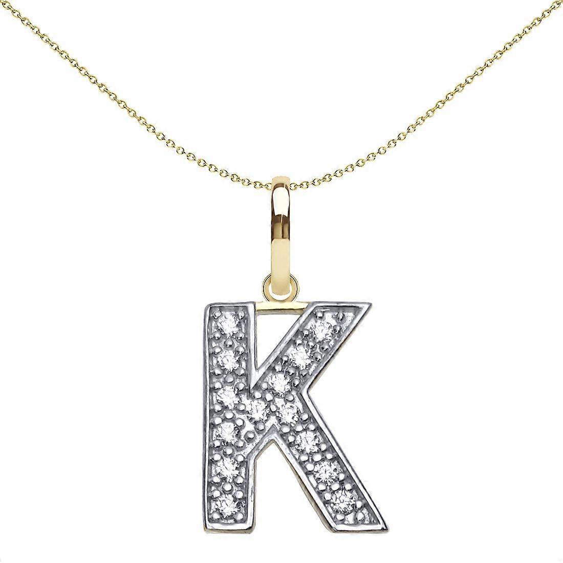 Jewelco London Solid 9ct Yellow and White Gold Cubic Zirconia 15mm San Serif Block Font Initial Charm Pendant, Letter K