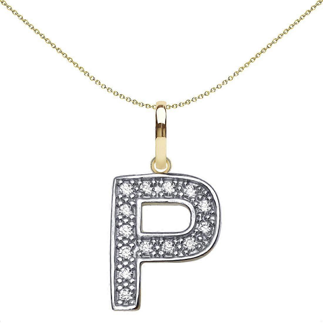 Jewelco London Solid 9ct Yellow and White Gold Cubic Zirconia 15mm San Serif Block Font Initial Charm Pendant, Letter P