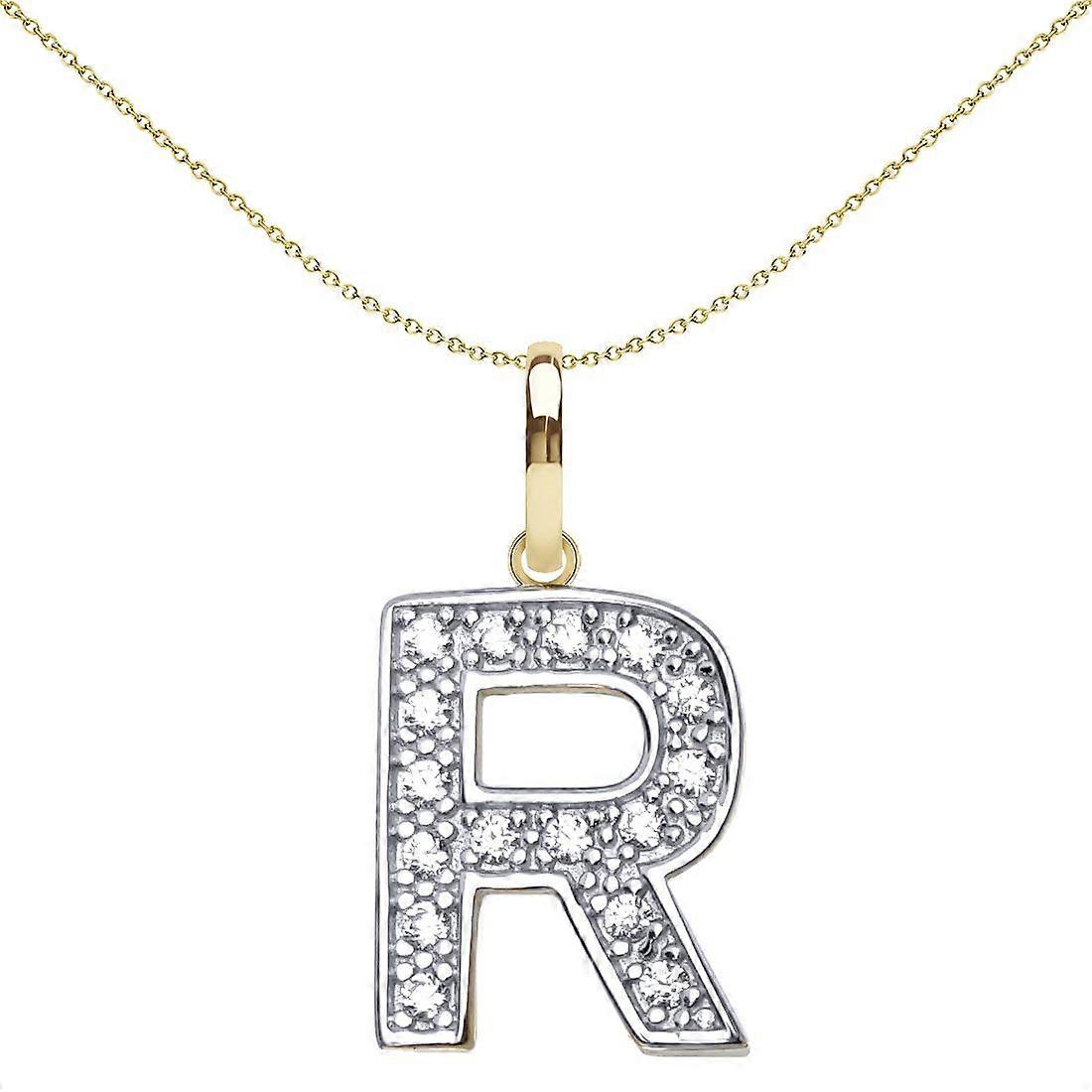Jewelco London Solid 9ct Yellow and White Gold Cubic Zirconia 15mm San Serif Block Font Initial Charm Pendant, Letter R