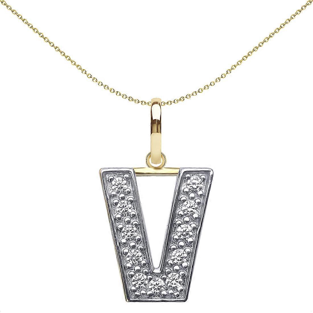 Jewelco London Solid 9ct Yellow and White Gold Cubic Zirconia 15mm San Serif Block Font Initial Charm Pendant, Letter V