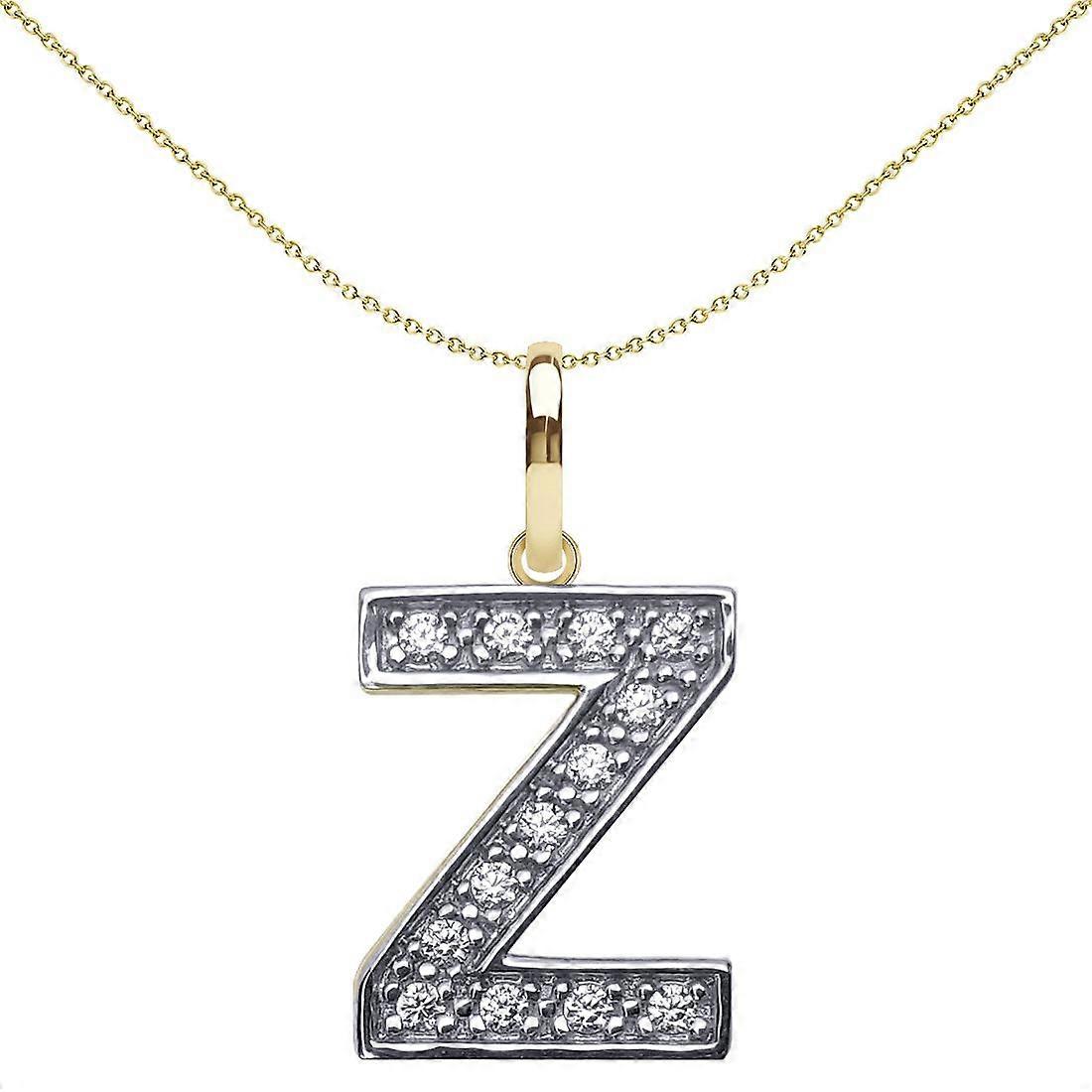 Jewelco London Solid 9ct Yellow and White Gold Cubic Zirconia 15mm San Serif Block Font Initial Charm Pendant, Letter Z