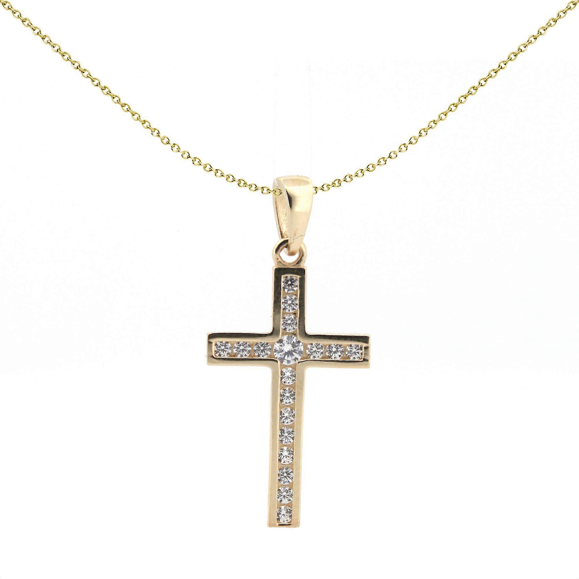 Jewelco London Solid 9ct Yellow Gold Cubic Zirconia Art Deco Outline Channel Set Cross Pendant. Includes a Yellow Gold-Plated Sterling Silver chain, which can be adjusted to 16, 18 or 20 inches. Height: 30mm (22mm excluding bale) Width: 14mm Weight (excluding chain): 1.4g Centre Stone: 2.5mm GEMSTONE: Cubic Zirconia, Round, White, Simulated SKU: JPX149