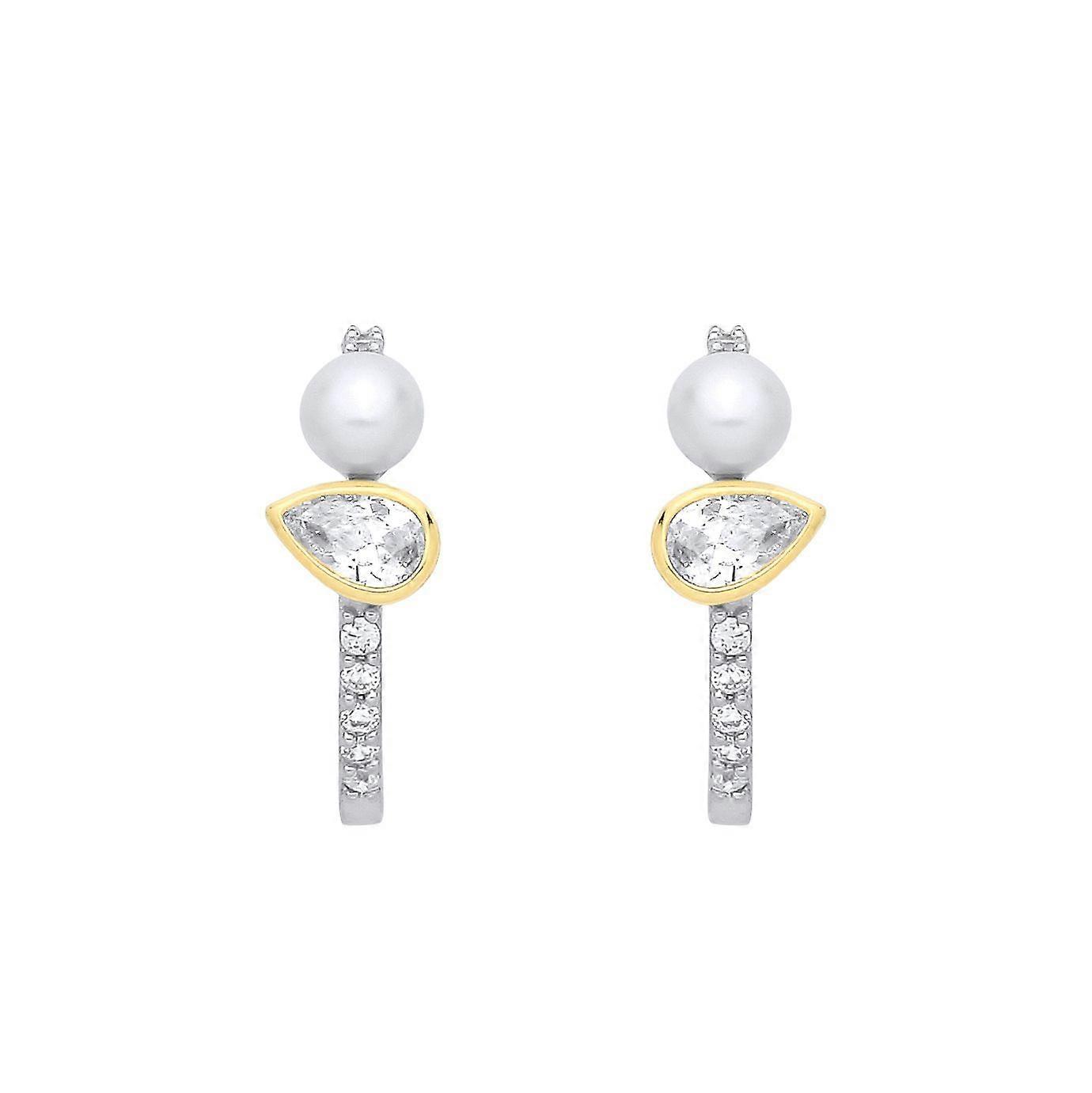 Jewelco London Sterling Silver & 18K Gold Plated CZ & Fresh Water Pearl Half Hoop Earrings