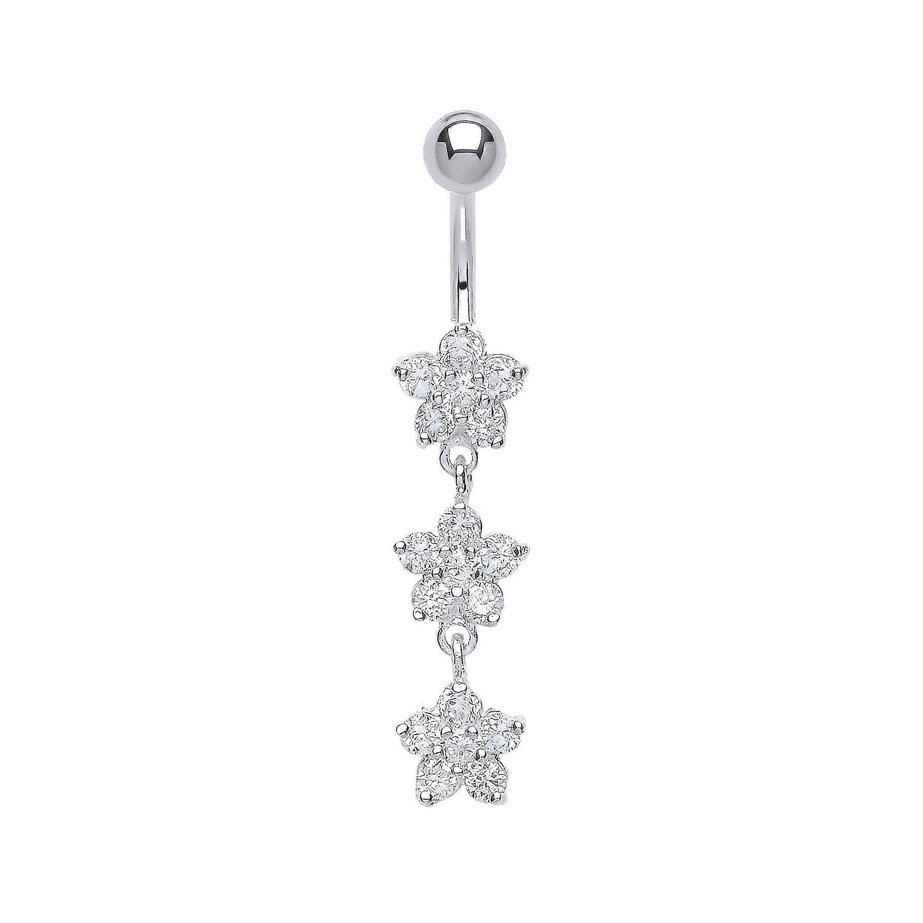 Jewelco London Sterling Silver Cubic Zirconia Triple Flower Cluster with Stainless Steel Belly Bar & Ball
