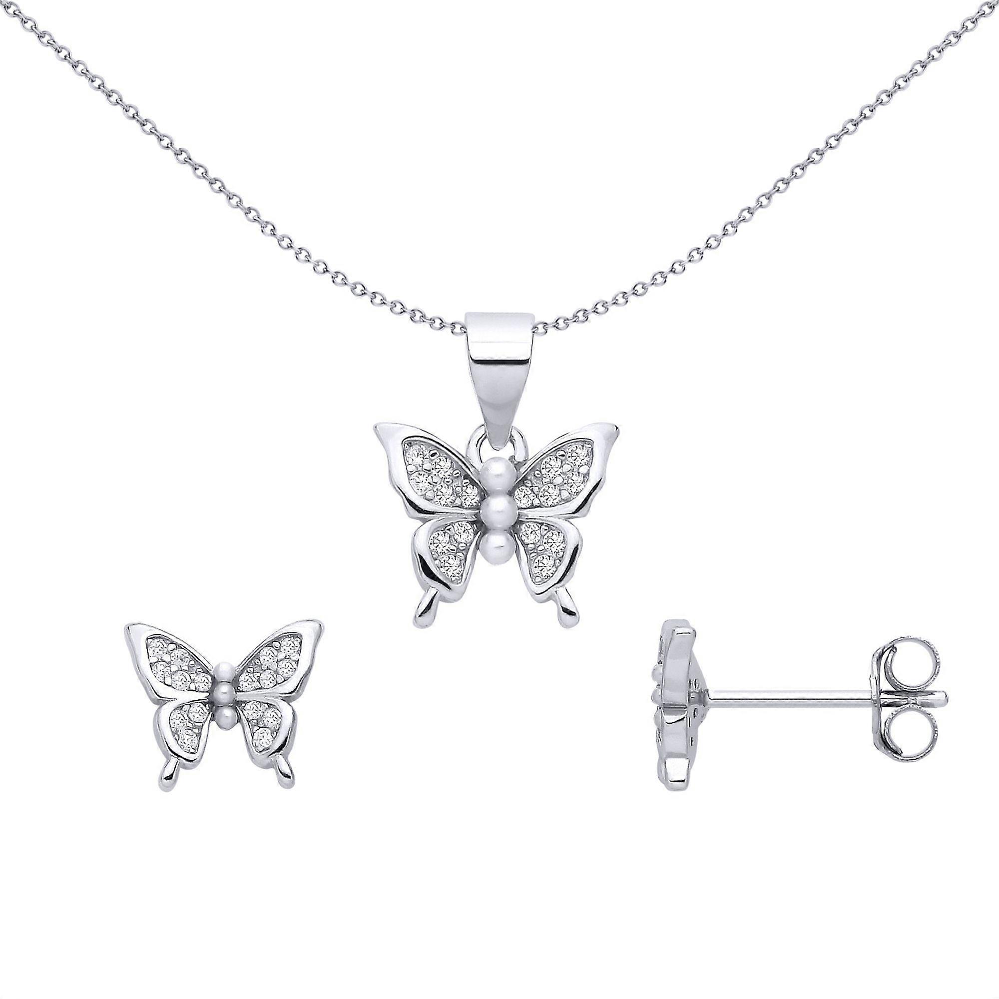 Jewelco London Sterling Silver CZ Butterfly Stud Earring & Pendant Set