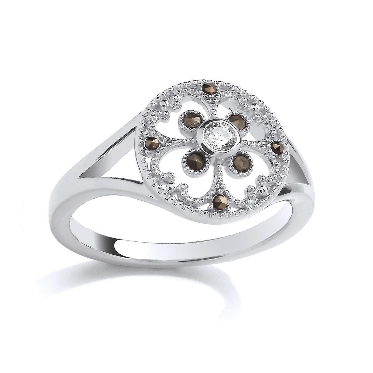 Jewelco London presents this piece from it's latest collection of Sterling Silver jewellery, a Sterling Silver CZ Filigree Floral Ring GEMSTONE: Cubic Zirconia, Round, White, Simulated GEMSTONE 2: Marcusite, Round, Brown, Simulated SKU: GSR1033