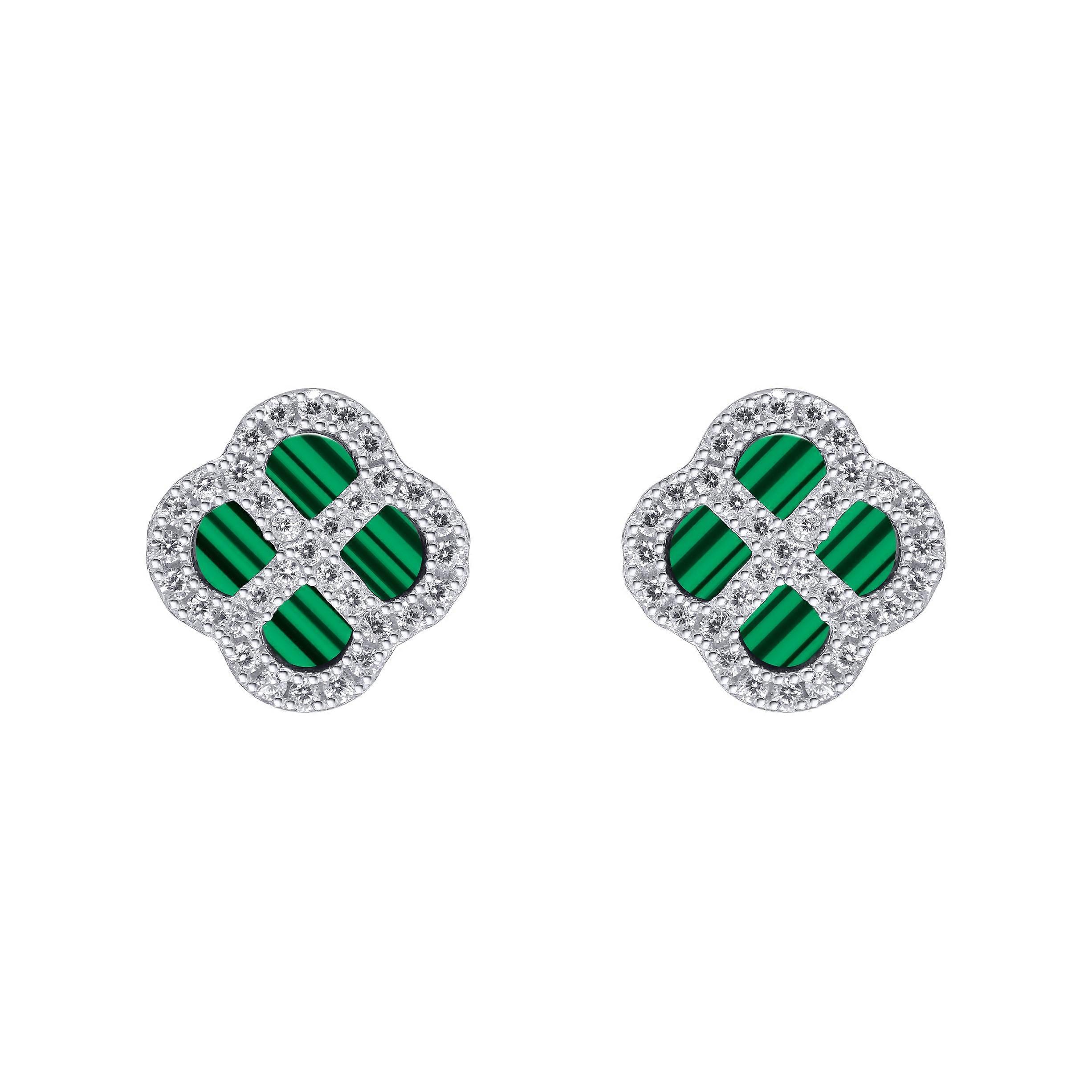 Jewelco London Sterling Silver CZ Green Malachite Clover Kiss Stud Earrings 11mm