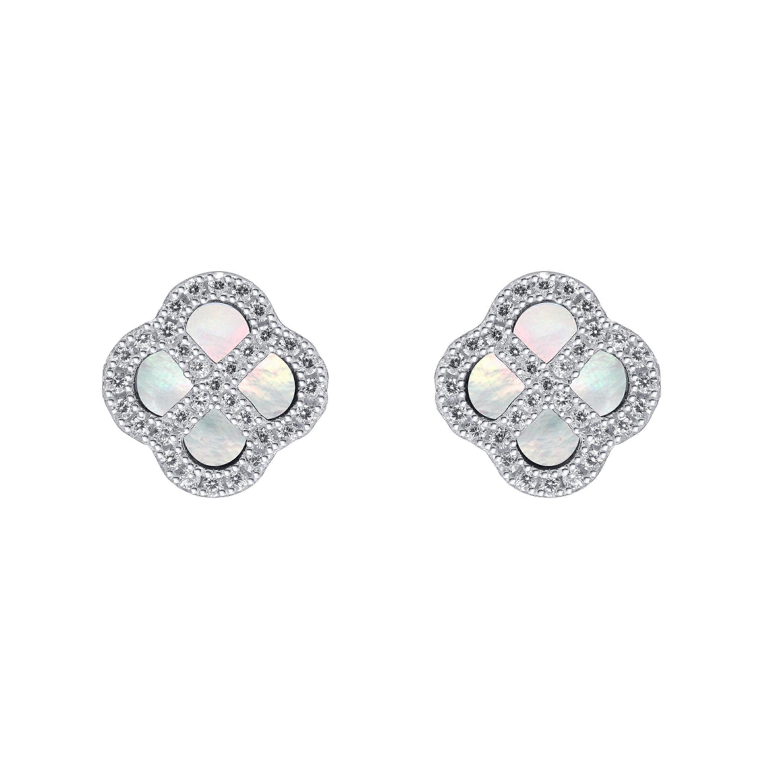 Jewelco London Sterling Silver CZ Mother of Pearl Clover Kiss Stud Earrings 11mm