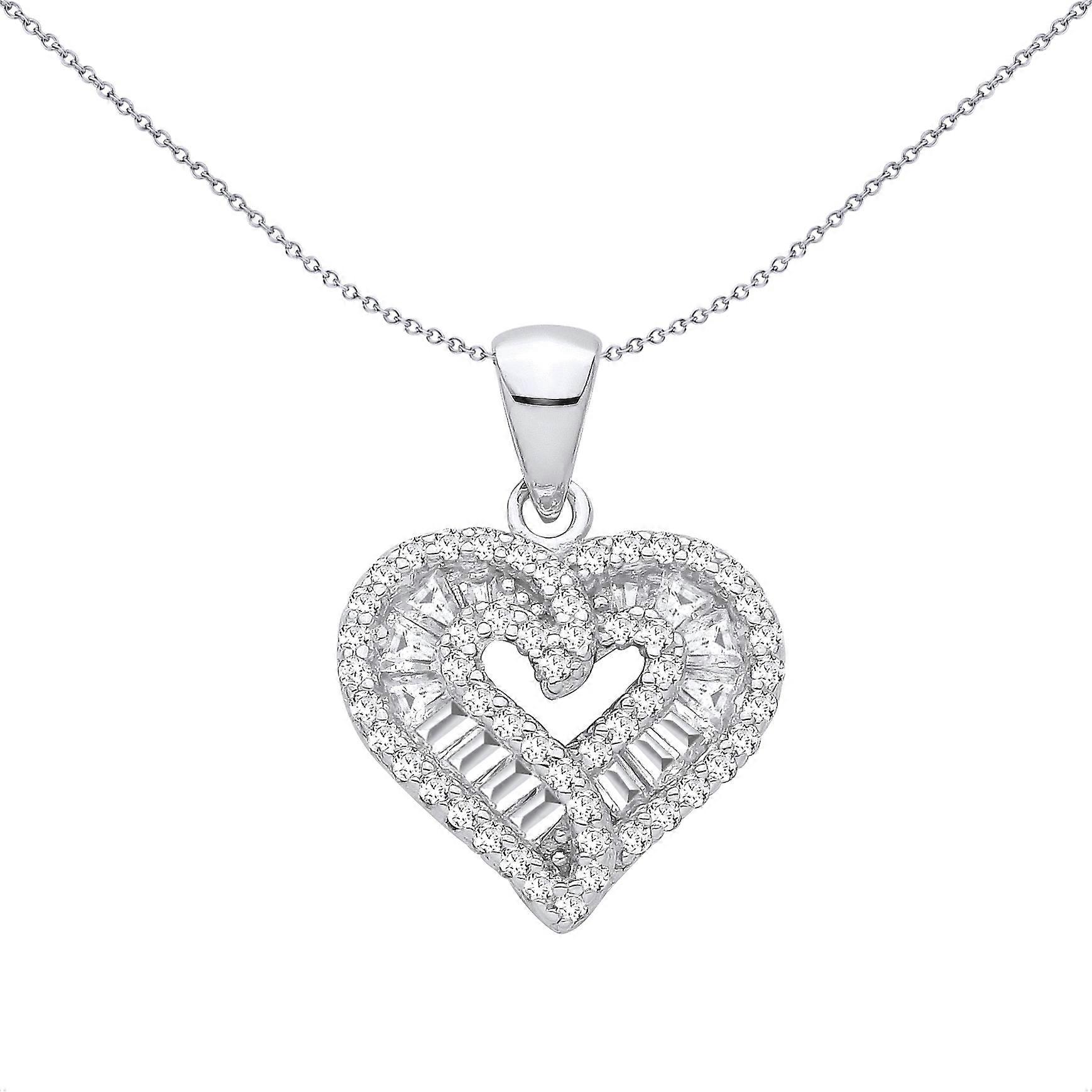 Jewelco London Sterling Silver CZ Round & Baguette Heart Pendant