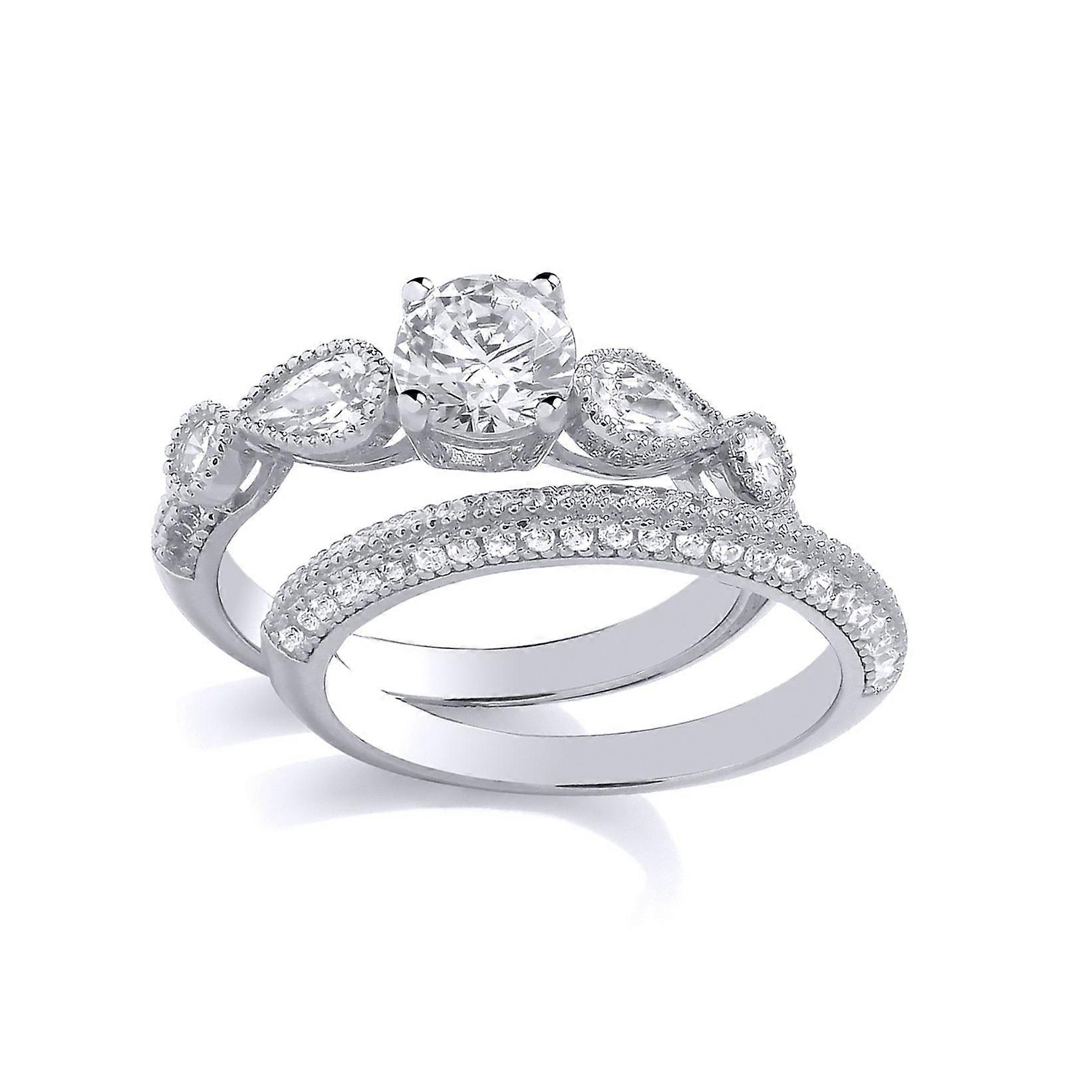 Jewelco London Sterling Silver CZ Round & Pear Cut Wedding Ring Set