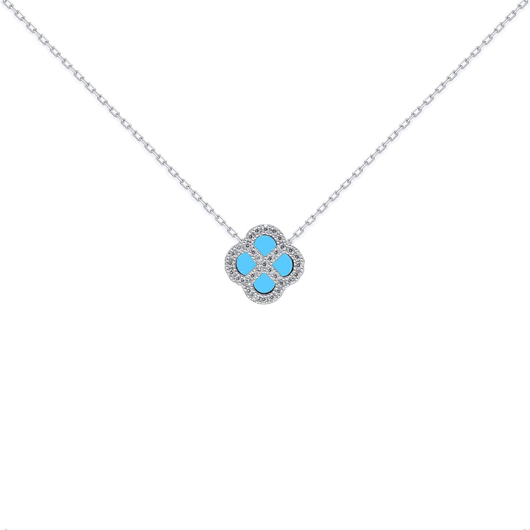 Jewelco London Sterling Silver CZ Turquoise Clover Kiss Lucky Charm Necklace 16-18"