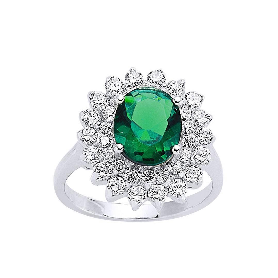 Jewelco London Sterling Silver Emerald-Green Oval Cubic Zirconia Royal Cluster Solitaire Engagement Ring