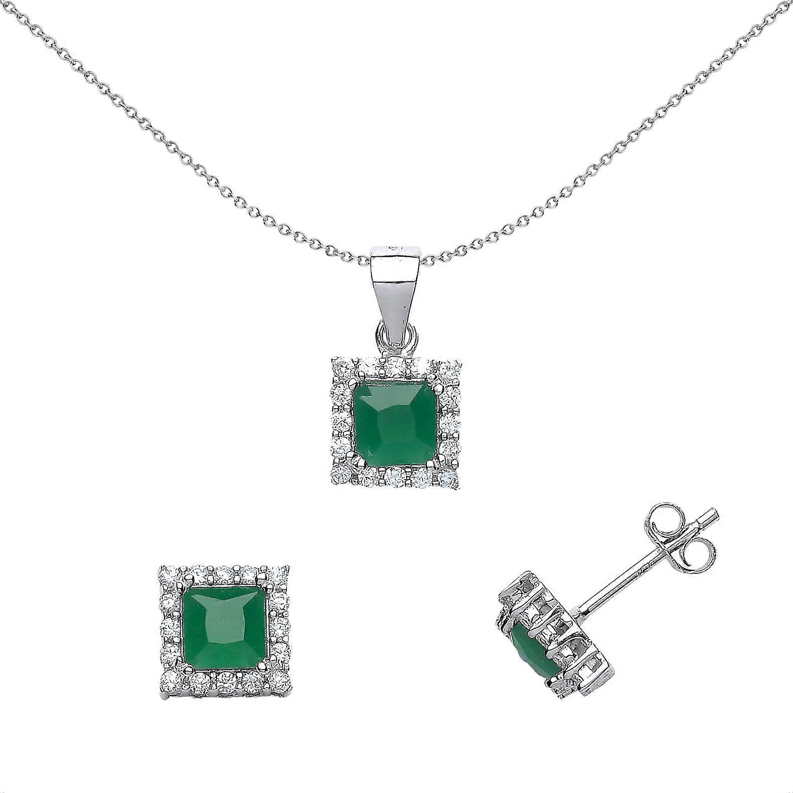 Jewelco London Sterling Silver Emerald-Green Princess Cut Cubic Zirconia Halo Princess Earrings Necklace Set 18 inch