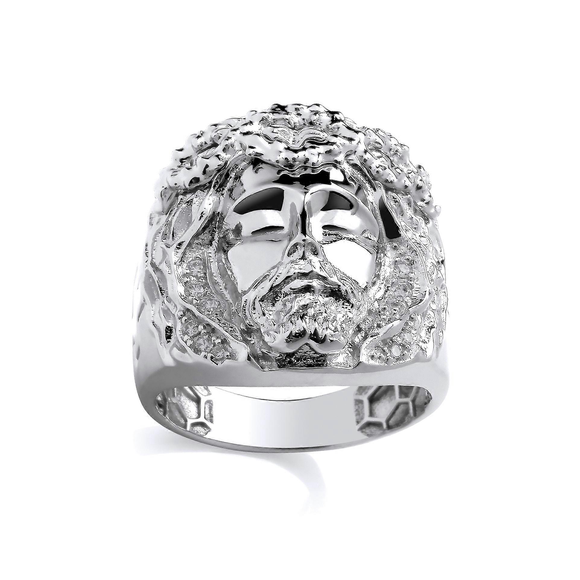 Jewelco London Sterling Silver Gents CZ Jesus Head Ring With Cross Engraved Shoulders