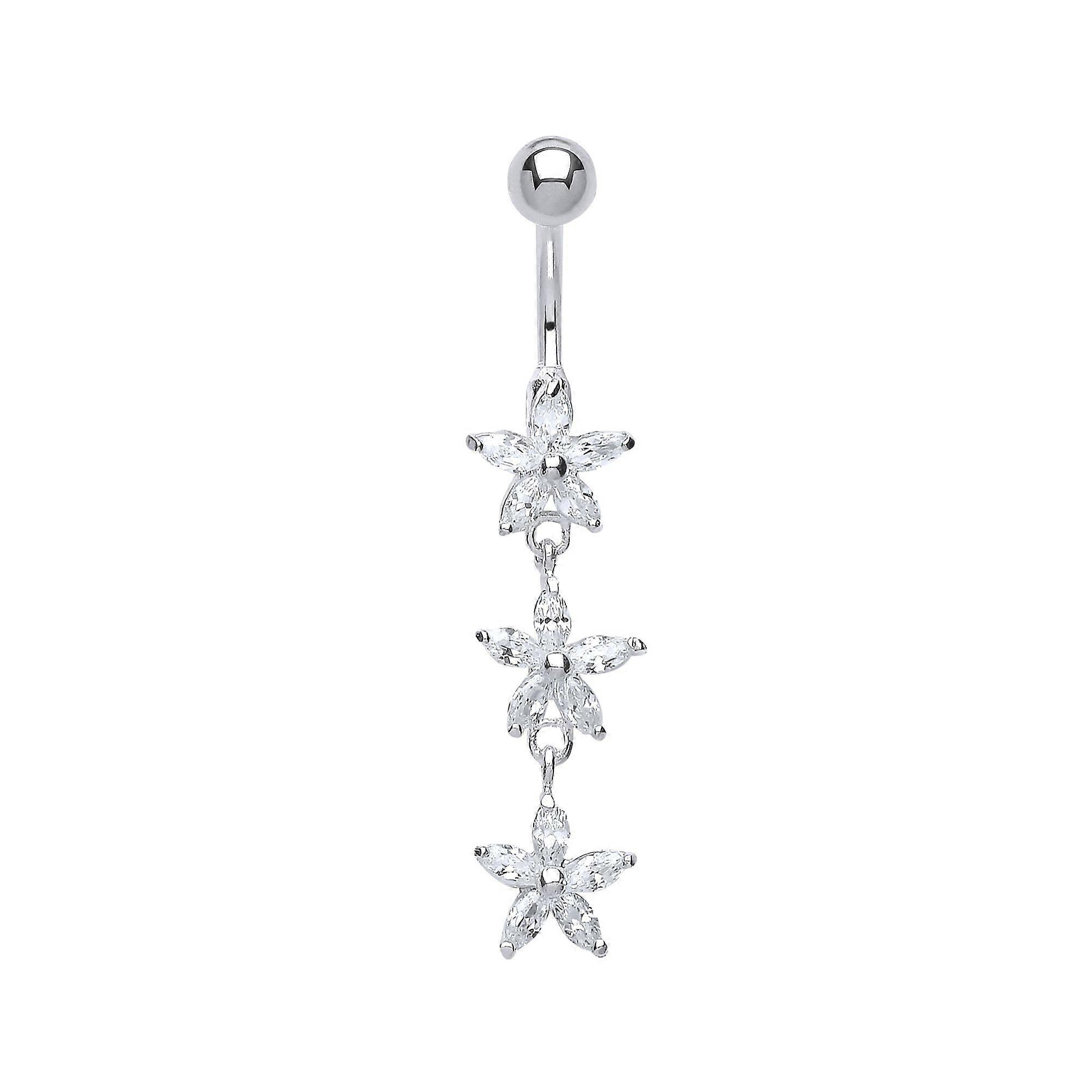 Jewelco London Sterling Silver Marquise Cubic Zirconia Trilogy Daisy with Stainless Steel Belly Bar & Ball