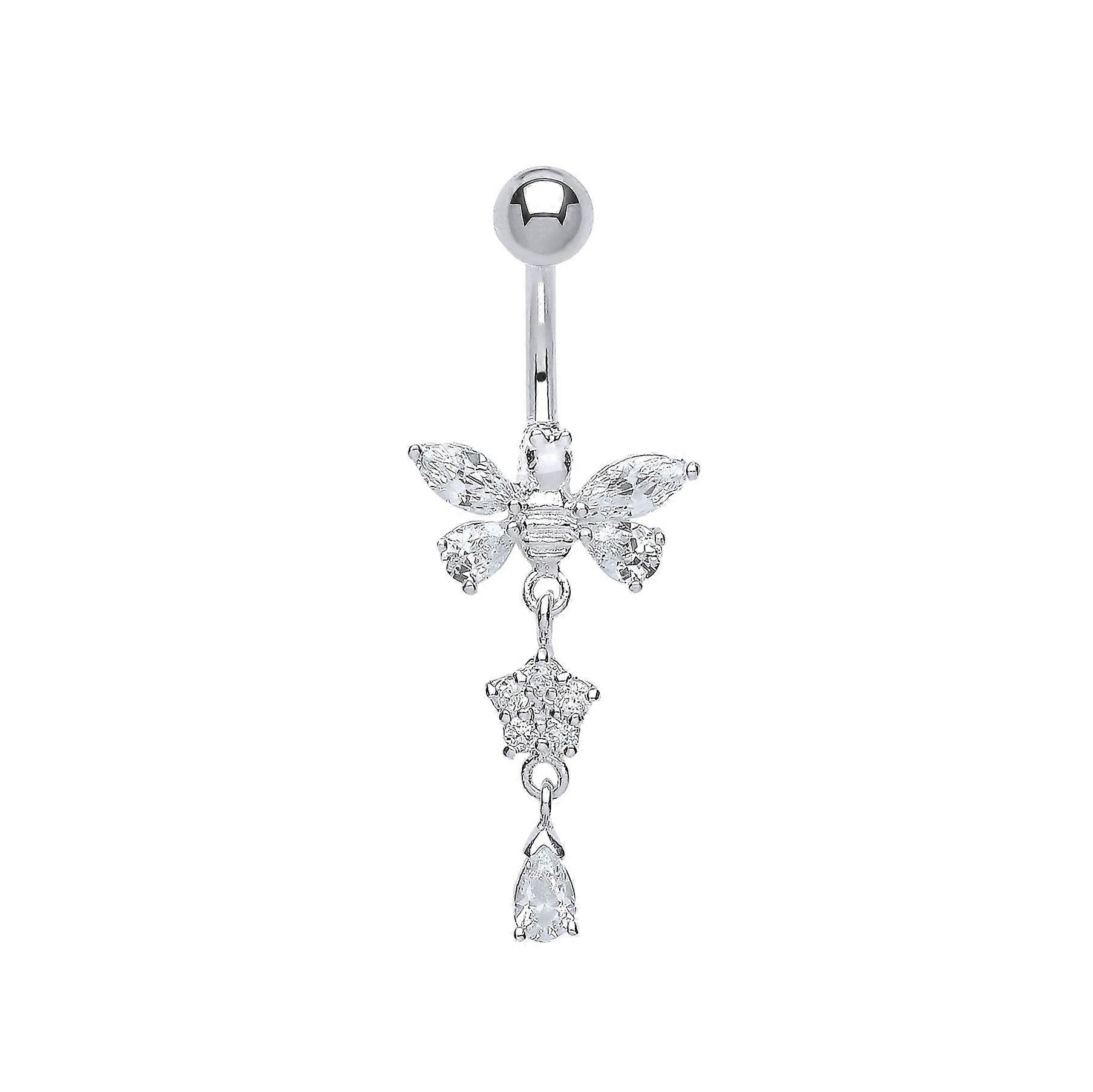 Jewelco London Sterling Silver Marquise Pear Cubic Zirconia Butterfly with Stainless Steel Belly Bar & Ball