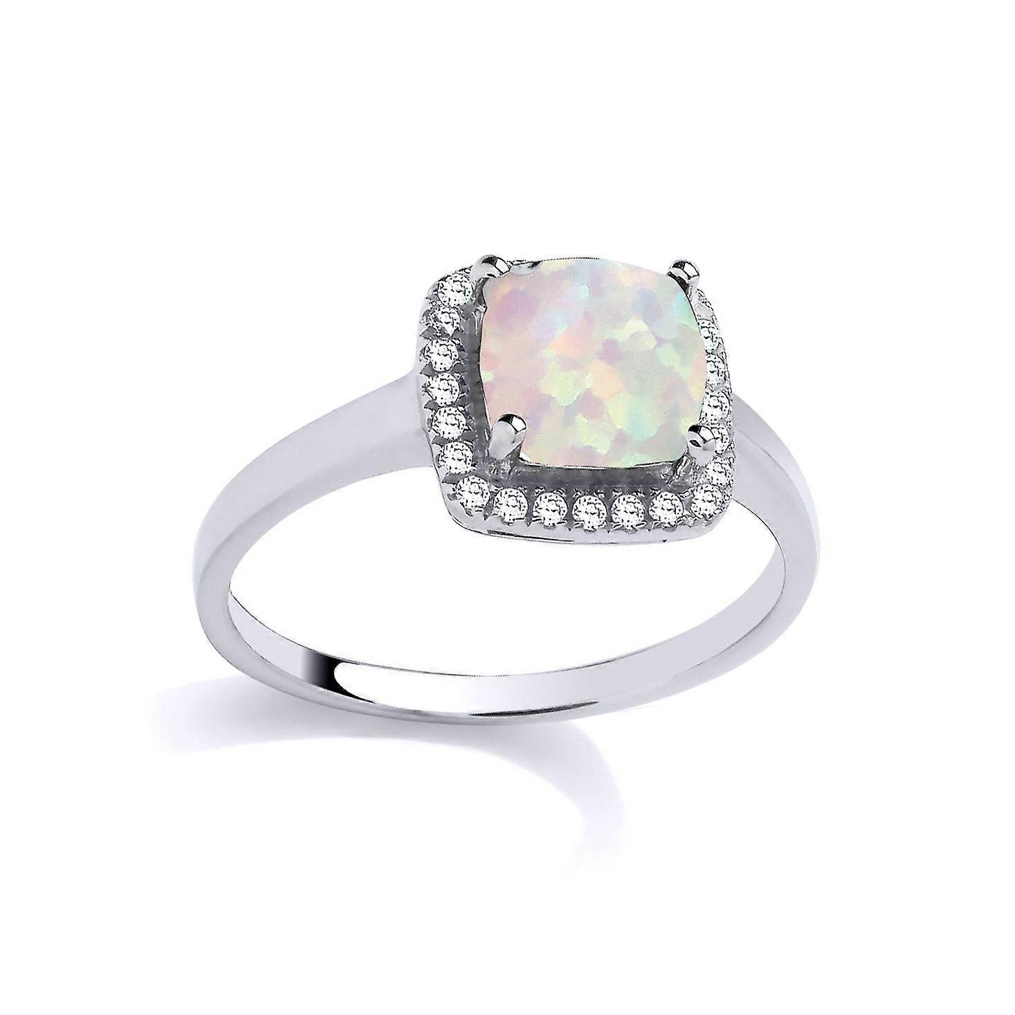 Jewelco London Sterling Silver Opal Cushion Cubic Zirconia Halo Cluster Solitaire Engagement Ring