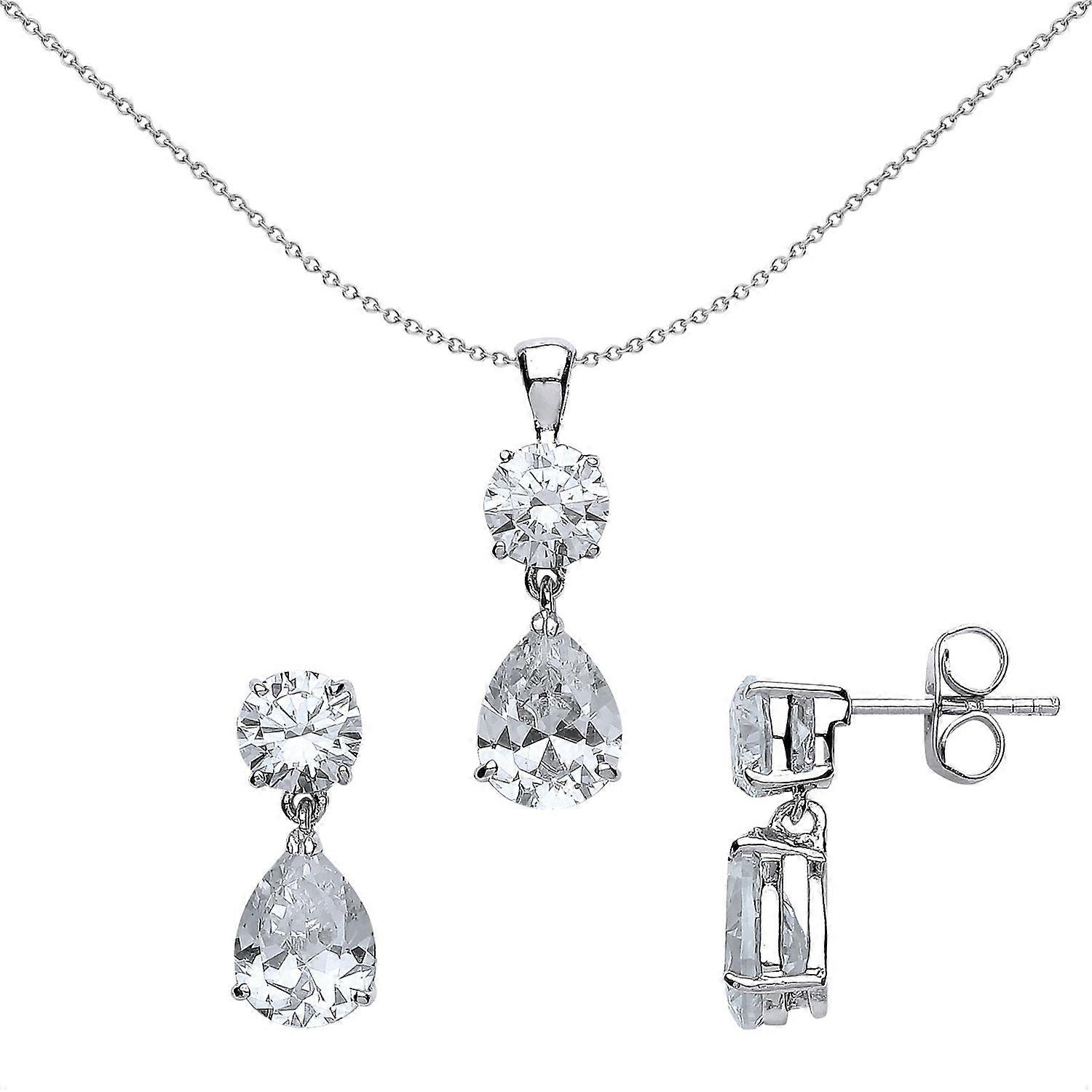 Jewelco London Sterling Silver Pear Cubic Zirconia Tears of Joy Toi et Moi Earrings Necklace Set 18 inch