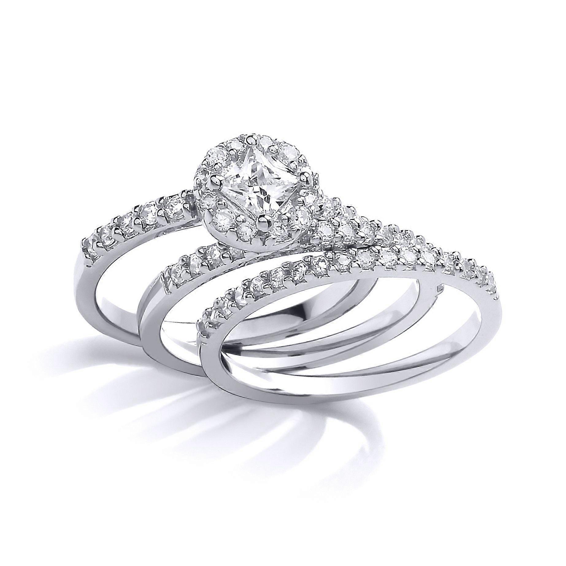 Jewelco London Sterling Silver Princess Cut CZ Halo Cluster Trilogy Eternity Wedfit Bridal Rings Set