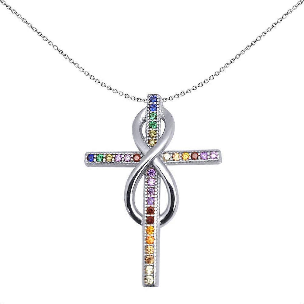 Jewelco London Sterling Silver Rainbow CZ Inifity Cross Pendant 26mm 18 inch