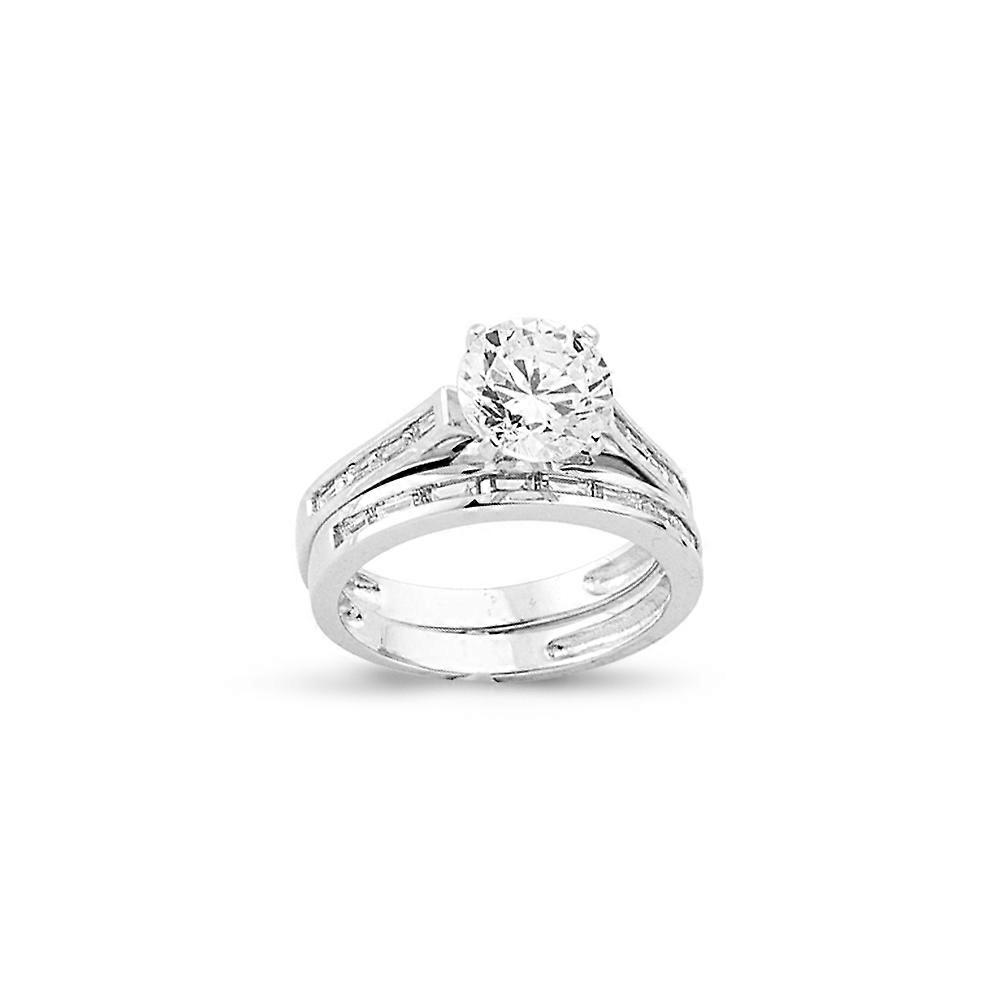 Jewelco London Sterling Silver Round & Baguette CZ Shoulder-set 4-Claw Solitaire Wedfit Bridal Rings Set