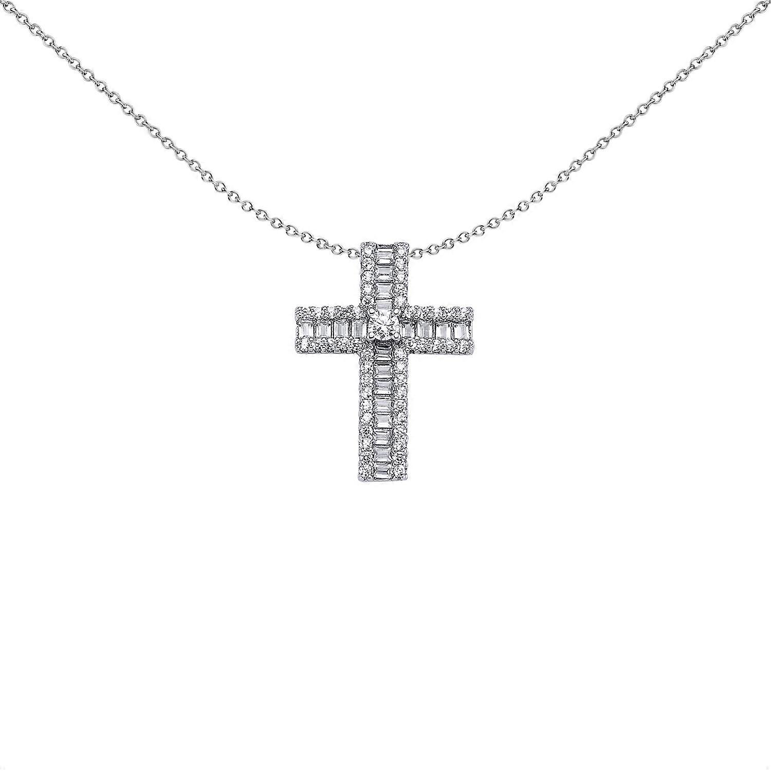 Jewelco London Unisex Rhodium Plated Sterling Silver Baguette Cubic Zirconia Art Deco Shimmering Solitaire Cross Pendant